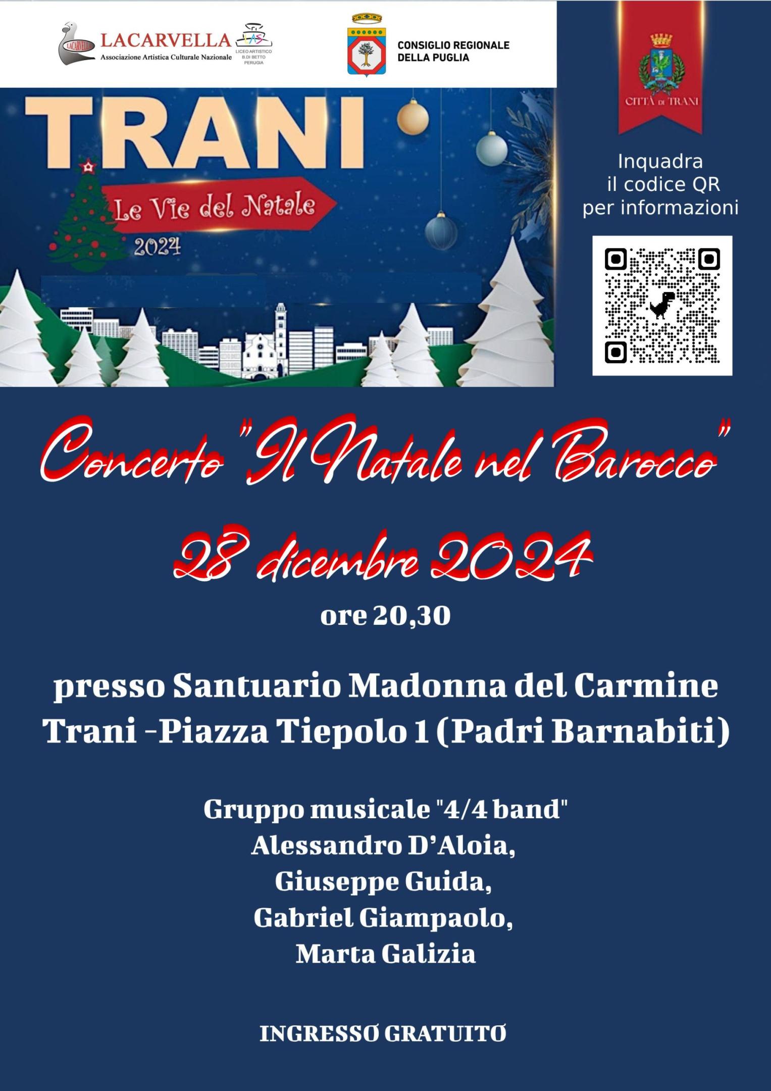L’Associazione Artistica Nazionale Lacarvella, con il patrocinio gratuito della Presidenza del Consiglio regionale Puglia, è inserita nel cartellone di Natale della città di Trani ed è lieta di invitare tutta la cittadinanza e non solo al concerto “Il Natale in Barrocco” nel giorno 28 dicembre alle ore 20:30 presso il Santuario della Madonna del Carmine situata nella Piazza Tiepolo 1 presso la citta’ di Trani a cura del direttore artistico Antonio Russo Galante e animato dal gruppo musicale 4/4 Band composto da: