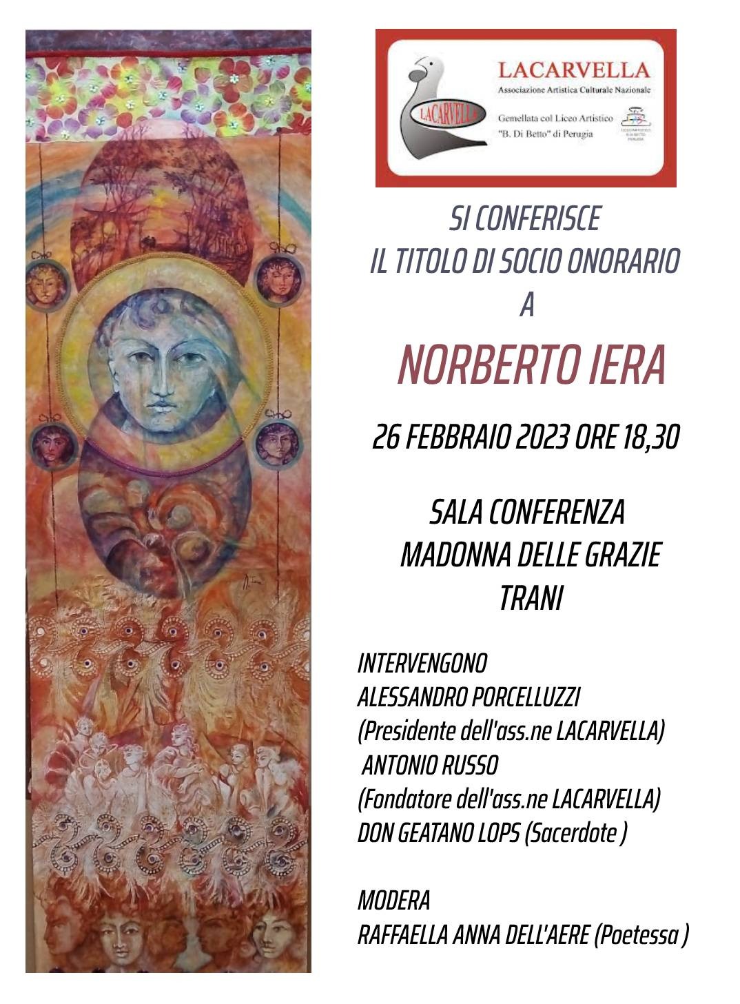 Norberto Iera, noto artista argentino, ha scelto da anni Trani come propria residenza e come fonte di ispirazione perpetua per le sue suggestive opere pittoriche, domenica 26 febbraio, riceverà la qualifica di socio onorario della Associazione Lacarvella. Un riconoscimento molto sentito da parte della Associazione e dovuto all’artista, le cui pregiate opere sono state esposte in ogni luogo del mondo: in Patagonia e in California, ad Oslo e ad Abu Dhabi. Un maestro, Norberto Iera, generoso con l’intera comunità tranese e pugliese, prodigo di consigli e incoraggiamenti per generazioni di artisti e da anni animatore della vita della Associazione Culturale “Lacarvella”. Durante la cerimonia, che si terrà presso la presso la Chiesa S.Maria delle Grazie, a partire dalle 18.30, interverranno: Alessandro Porcelluzzi, presidente della associazione Lacarvella; Antonio Russo, fondatore della associazione Lacarvella; don Gaetano Lops, sacerdote. Presenterà la serata Raffaella Anna Dell’Aere, poetessa e socia della Lacarvella.